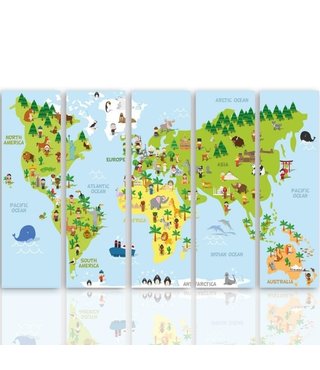 Schilderij - Wonderlijke Wereld - Wereldkaart, 5 luik - Karo-art VOF